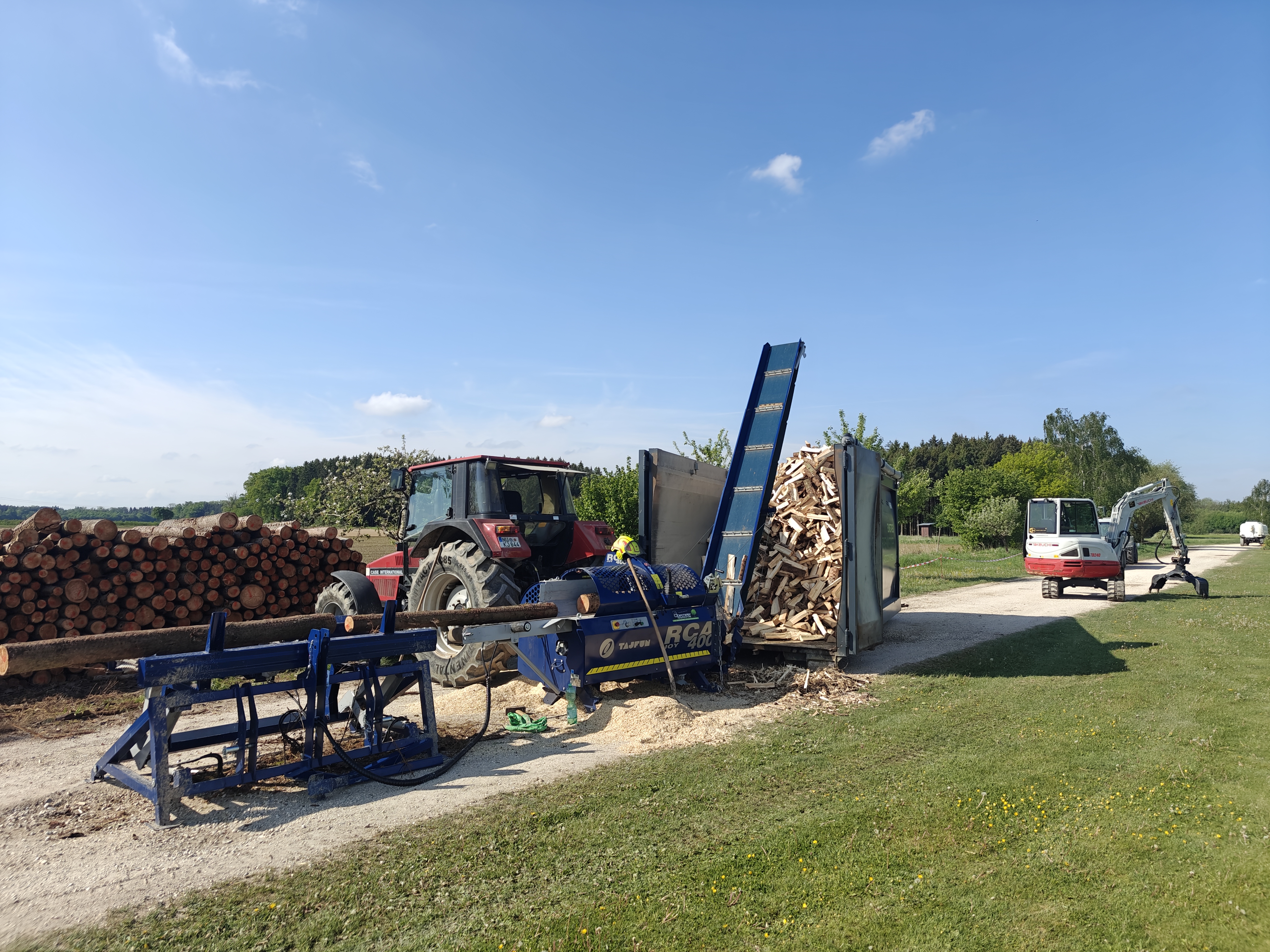 Wir rücken mit Traktor angehängtem Sägespaltautomat sowie unserem Hebetisch an. Nach kurzem Aufbau sind wir startklar und können Baumstämme von 2 Meter bis zu 6 Meter Länge und bis 40 cm Stammdurchmesser durch unseren Hebetisch vom Boden aufnehmen und unserer Maschine zuführen. Danach wird das Holz auf die gewünschte Länge abgesägt. Hierbei sind Längen von 25cm, 30cm, 33cm, 35cm, 38cm, 40cm, 45cm und 50 cm möglich. Danach spaltet entweder unser 4-fach Spaltkreuz oder unser 8-fach Spaltkreuz das Holzstück in schöne ofenfertige Stücke. Diese werden dann über ein 5 Meter schwenkbares Förderband an die benötige Stelle befördert. Holzlager, Hänger Big Bags oder ähnliches