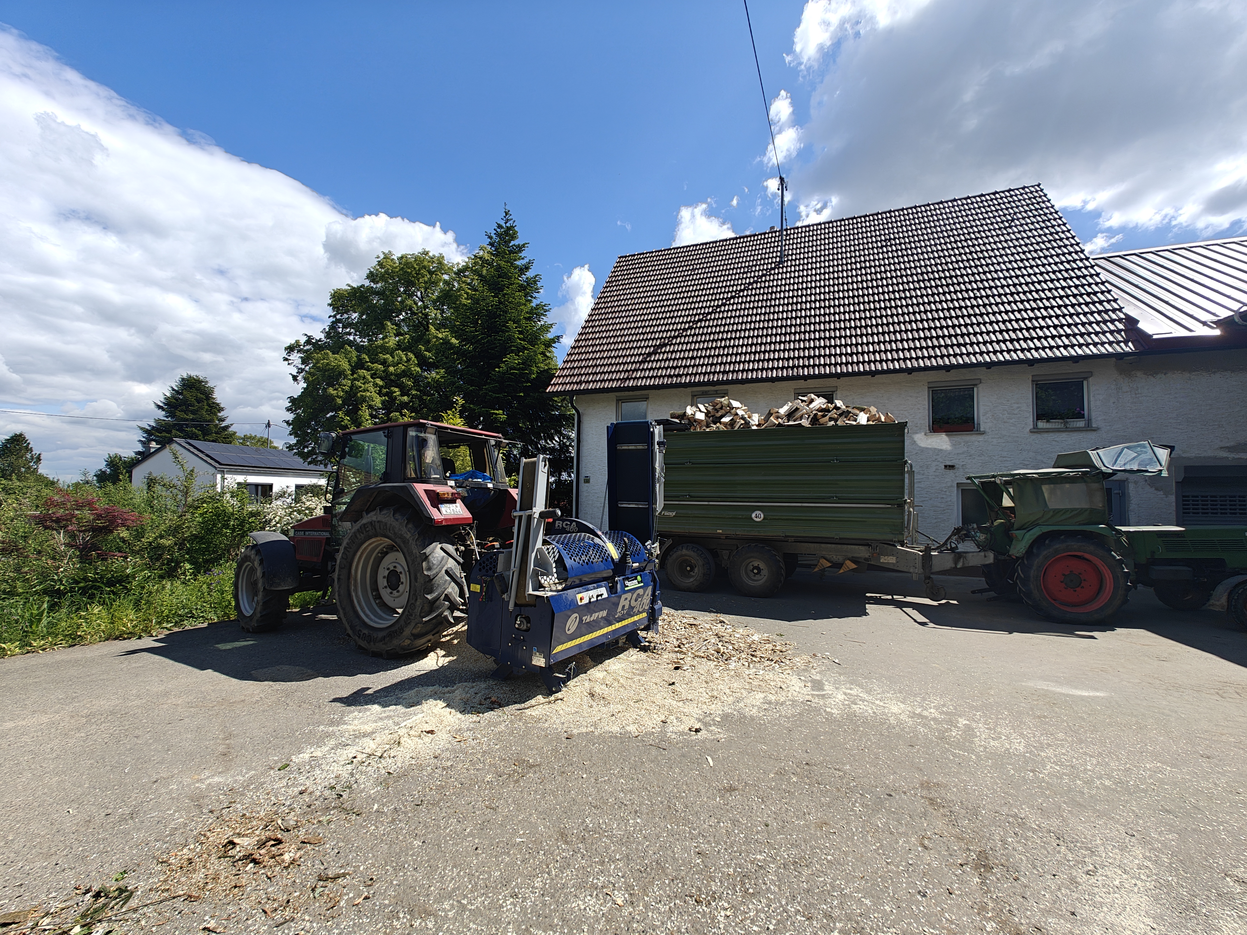 Dann haben wir die richtige Lösung für sie zur Hand - Mit unserem Sägespaltautomat Tajfun RCA 400 und unserem Tajfun Hebetisch DM 2000 verarbeiten wir ihr Holz in kurzer Zeit zu ofenfertigen Scheiten.